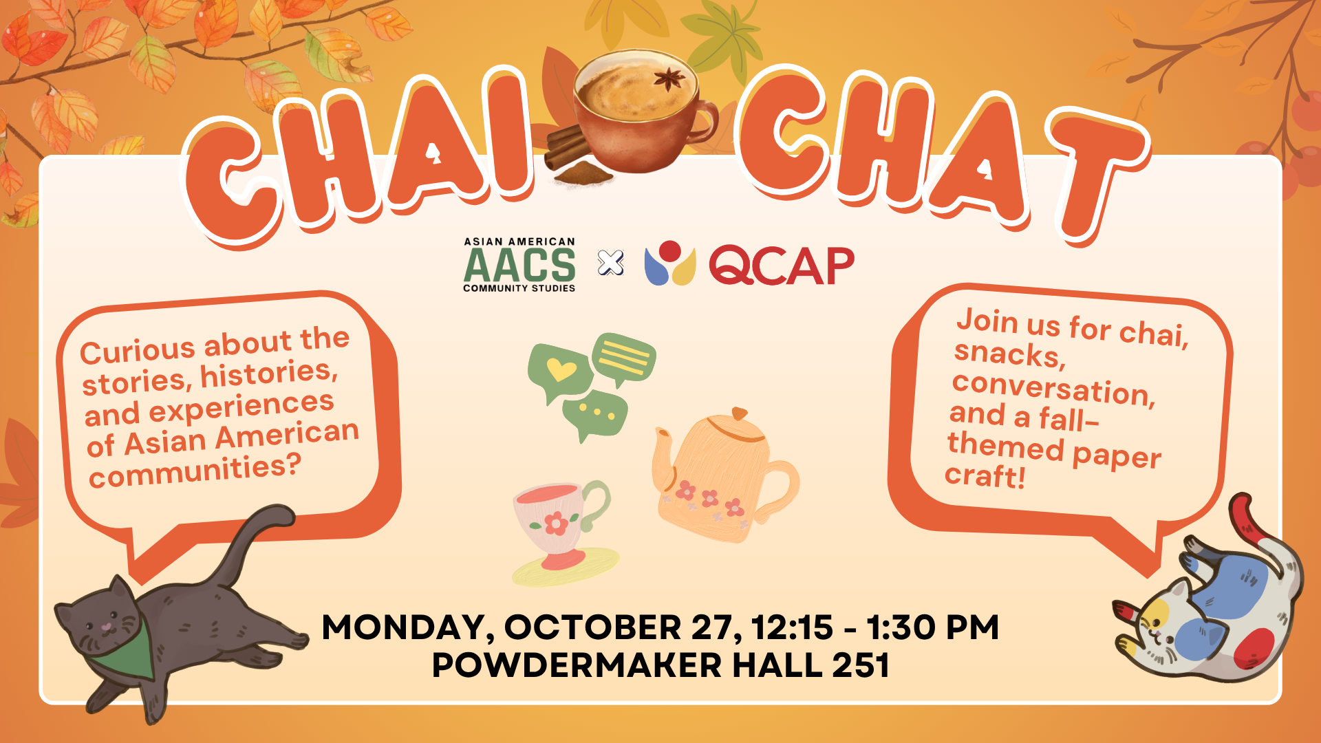 Join AACS and QCAP for our first Chai Chat of the fall! Come by the QCAP Community Space for chai, snacks, conversation, and community! We’ll be chatting about traditions and doing a simple Halloween-themed paper craft. It’s also a chance to learn more about QC’s Asian American Community Studies (AACS) Minor and about QCAP and to ask any questions you might have!