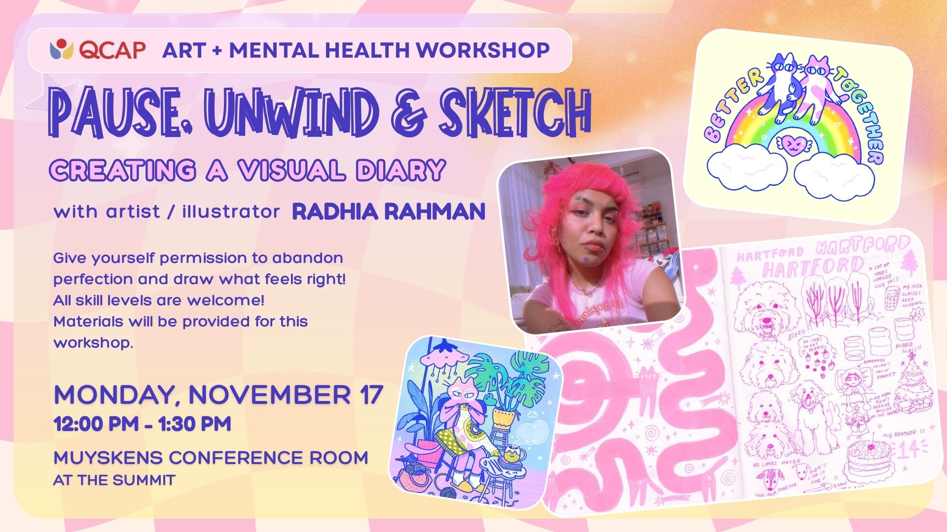 Pause, Unwind & Sketch: Creating a Visual Diary is part of a series of workshops that focus on art-making and mental health, sponsored by QCAP (the Queens College AANAPISI Project). …