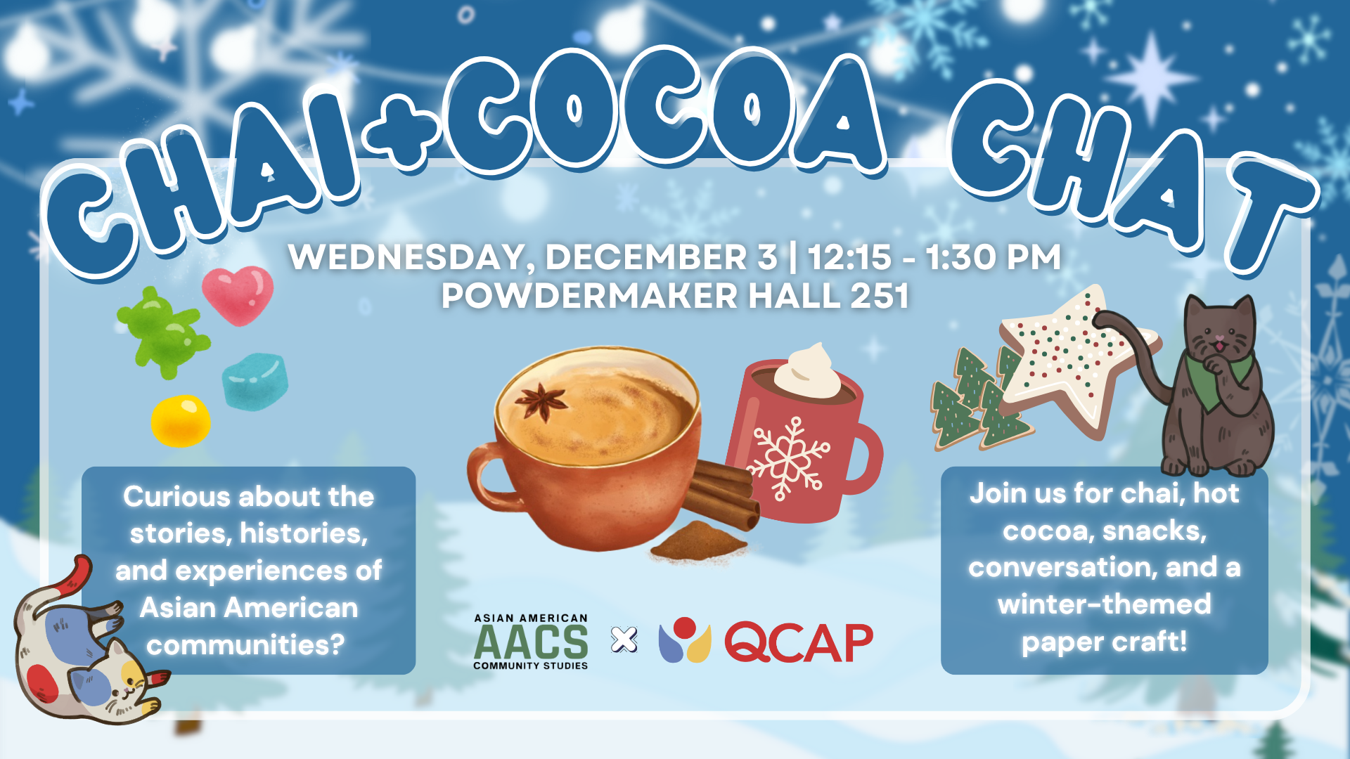 Join AACS and QCAP for our second Chai Chat of the fall, this time with some hot cocoa as well! Come by the QCAP Community Space for chai, snacks, conversation, …