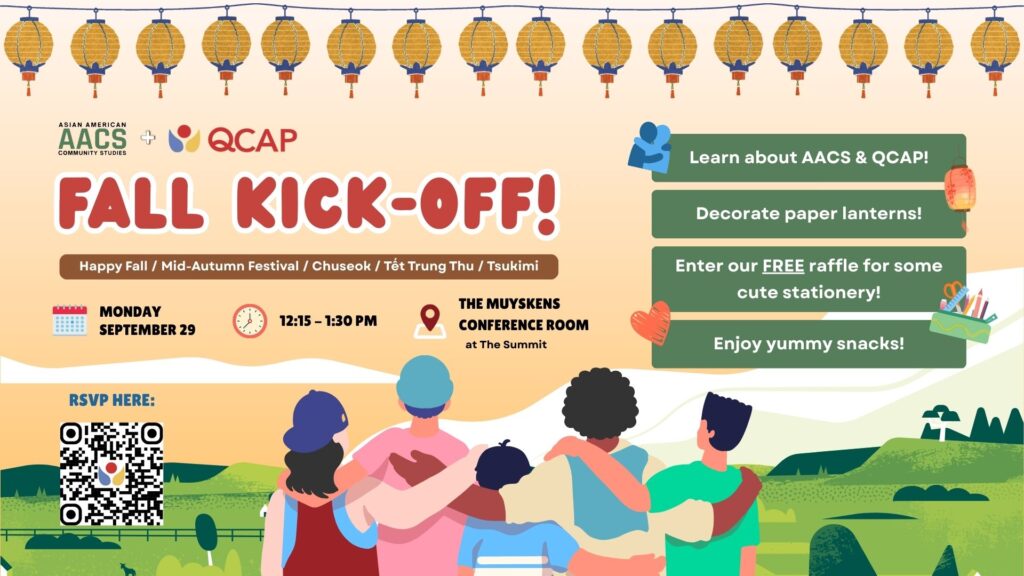 Join QCAP (the Queens College AANAPISI Project) and AACS (QC’s Asian American Community Studies program) on Monday, September 29, 2025, from 12:15-1:30pm, in the Muyskens Conference Room in the Summit (see campus map) for our Fall Kick-off event!
